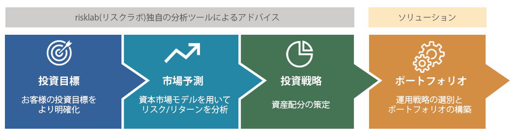 お客様が望まれる、投資成果、投資制限、リスク許容度の組み合わせはお客様それぞれで異なります。異なる運用目標やポートフォリオの現状を踏まえて最適なソリューションを見つけることは容易ではありません。 risklab(リスクラボ)は、お客様との信頼関係を大切にし、お客様それぞれが求める異なるニーズを深く理解し、 目標に向けてお客様ごとに作成する実行可能なアドバイスとより現実性の高いソリューションを提供します。