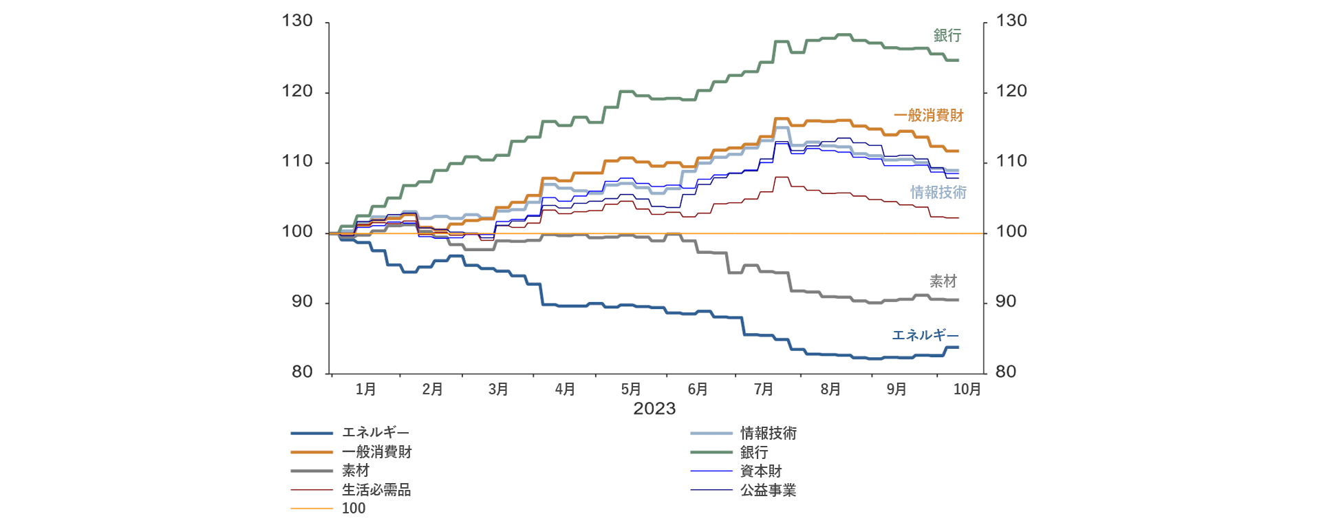 MSCIヨーロッパ指数構成セクター:年初来の12カ月先利益予想(2023年1月1日を100とする)