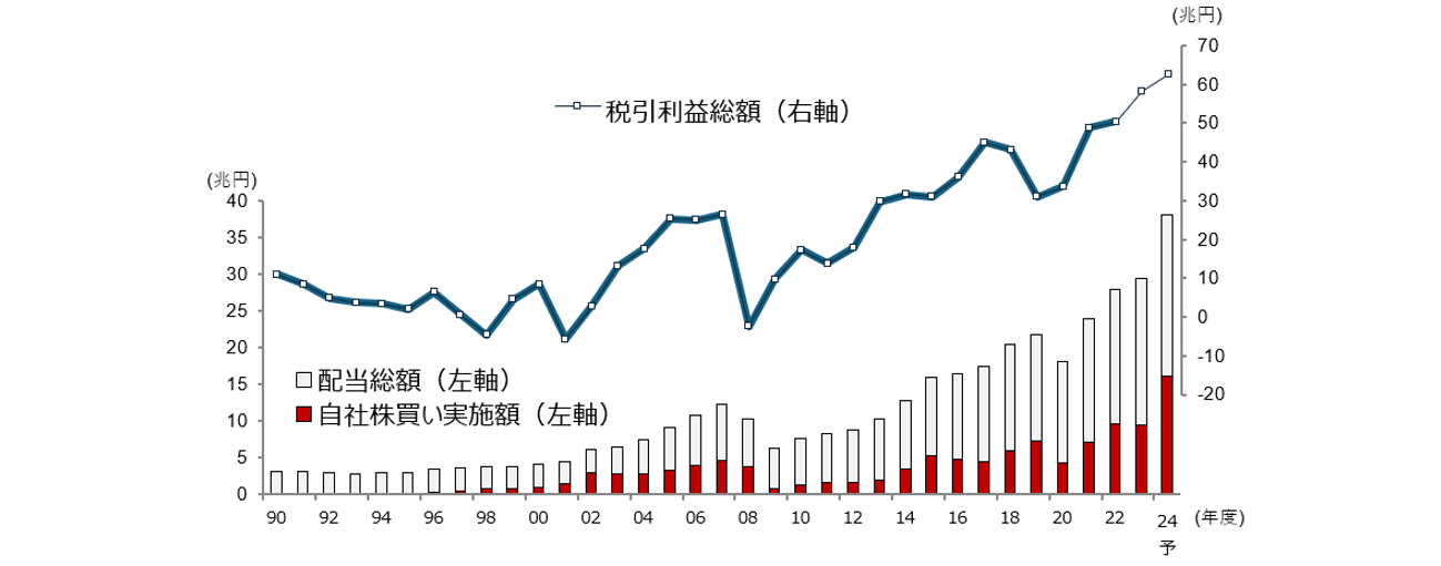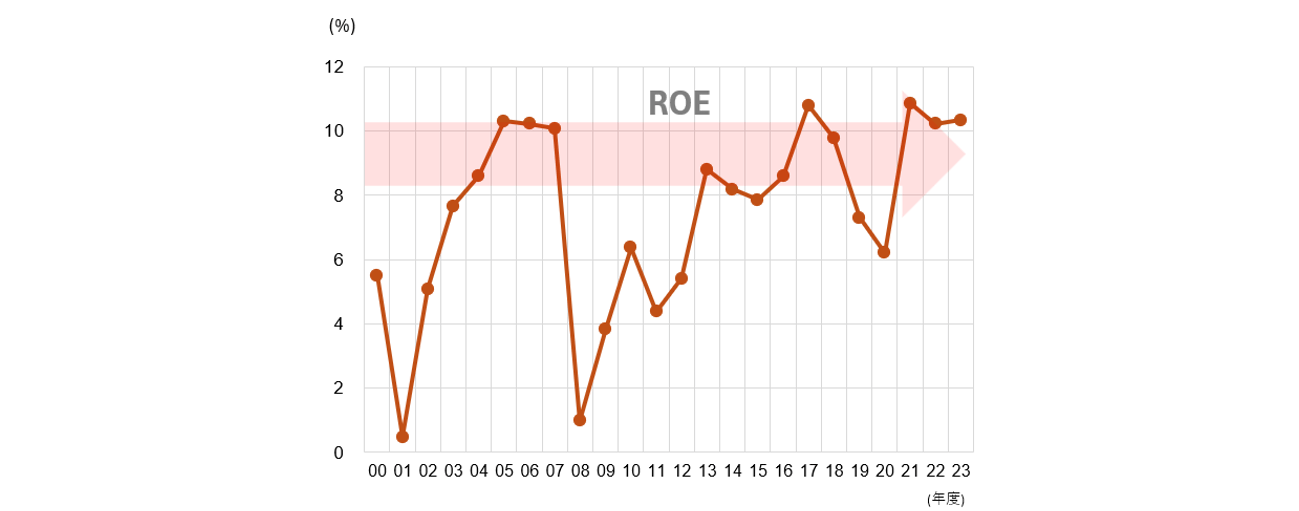③低いROE:日本企業は株主還元を拡充させています(図表4参照)。配当と自社株買いで自己資本の上昇を抑制することは資本効率を高めることにつながりますが、実際にはROEはほぼ横ばいで明確な上昇は確認できません(図表5参照)。これは、株主還元は増えたものの利益額も増加しているため内部留保は積み上がり続けているためと考えられます。最適なバランスシートを志向し、そこに向かった大胆な施策を打っていくことで事業リスクに見合った自己資本の適正水準に近付き、ROEは上昇していくものと考えます。