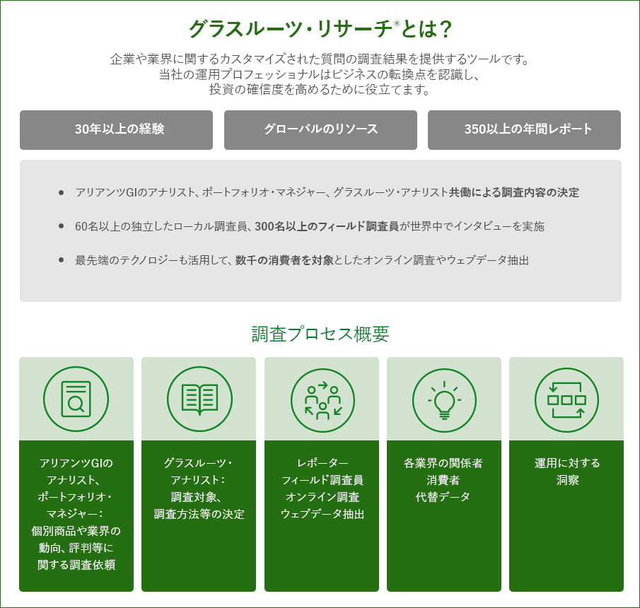 当社株式運用プラットフォームのリサーチの強みとして、グラスルーツ・リサーチ®(https://jp.allianzgi.com/about-grassroots-research)とグローバル・リサーチ・コラボレーションがあげられます。また積極的なエンゲージメント活動(https://jp.allianzgi.com/engagement-and-corporate-governance.pdf)によって企業価値向上にも貢献しています。