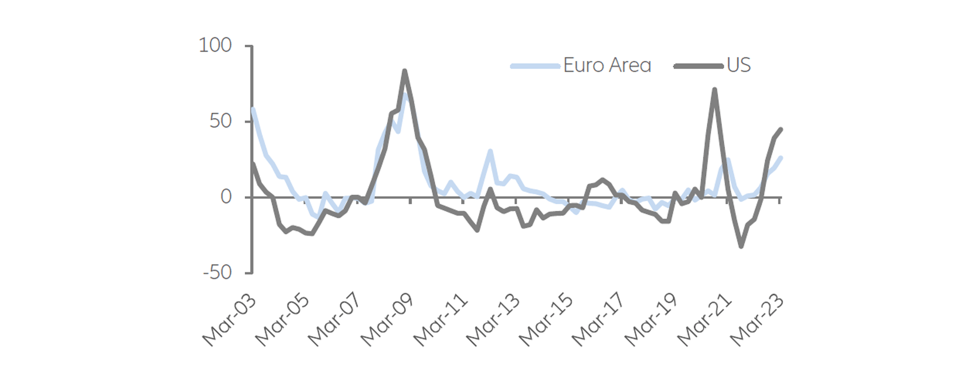 市場において金融引き締めの指標として特に注視されているのは、FRBとECBが実施する銀行貸付調査です。上記の図表 が示すとおり、金融引き締め政策の加速によって、信用供与に対する銀行の姿勢がより慎重になったため、貸付基準は2022年を通して厳格化され始めています。