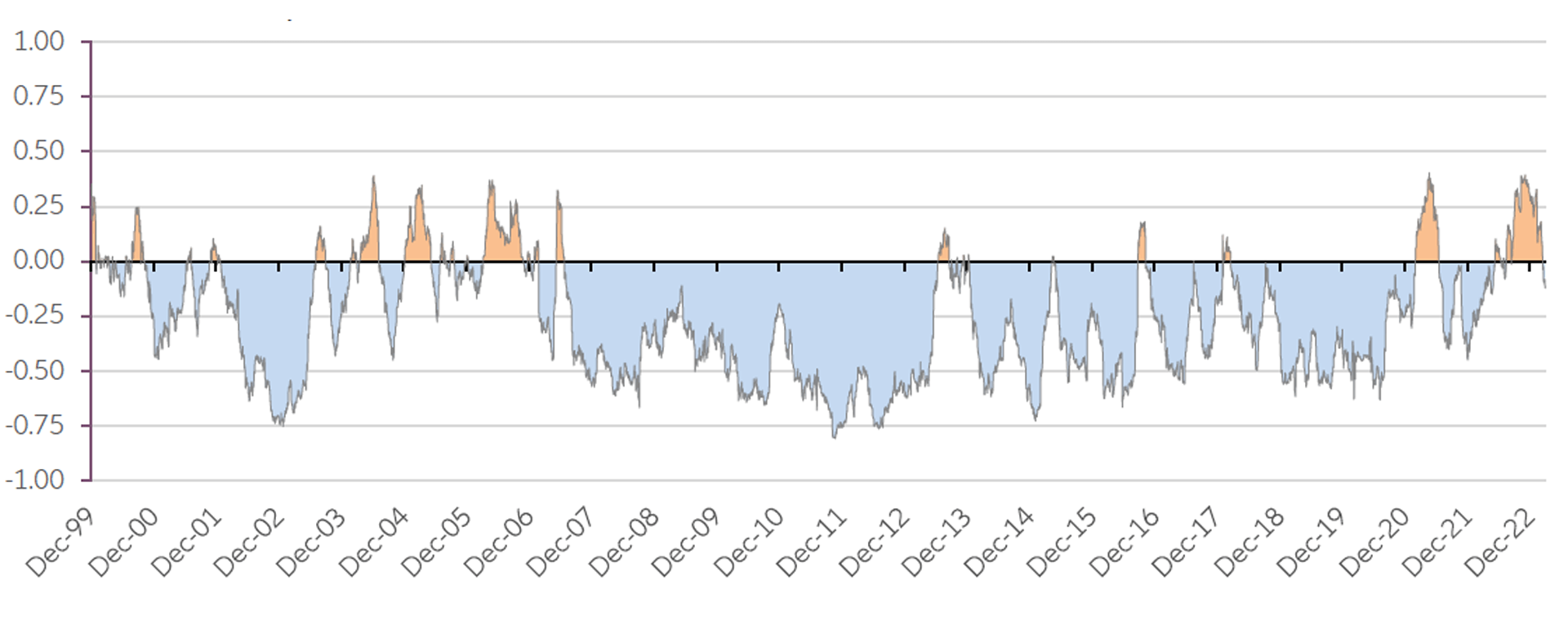 暫定データは、2023年はマイナス金利/低金利環境が終わるだけでなく、分散化の復活の兆しとなる可能性があることを示唆しています。以下のグラフ が示す通り、米国株と米国国債の日次リターンの63日間移動相関は、2001年以降、 これまでほとんどマイナスの領域にありました。わずかに相関がプラスとなったのは、数期間に留まります。2022年には、インフレが市場における主要かつほぼ唯一のマクロドライバーであったため、相関は明らかにプラスであり、分散化はほぼ皆無の状況でした。このため、マルチアセットポートフォリオは株式市場と債券市場の両方からマイナスの影響を受けました。最新のデータは、2023年には分散化が復活した状態に戻り、マルチアセットポートフォリオが有効な「全天候型」の特徴を取り戻す一助となる可能性があることを示しています。