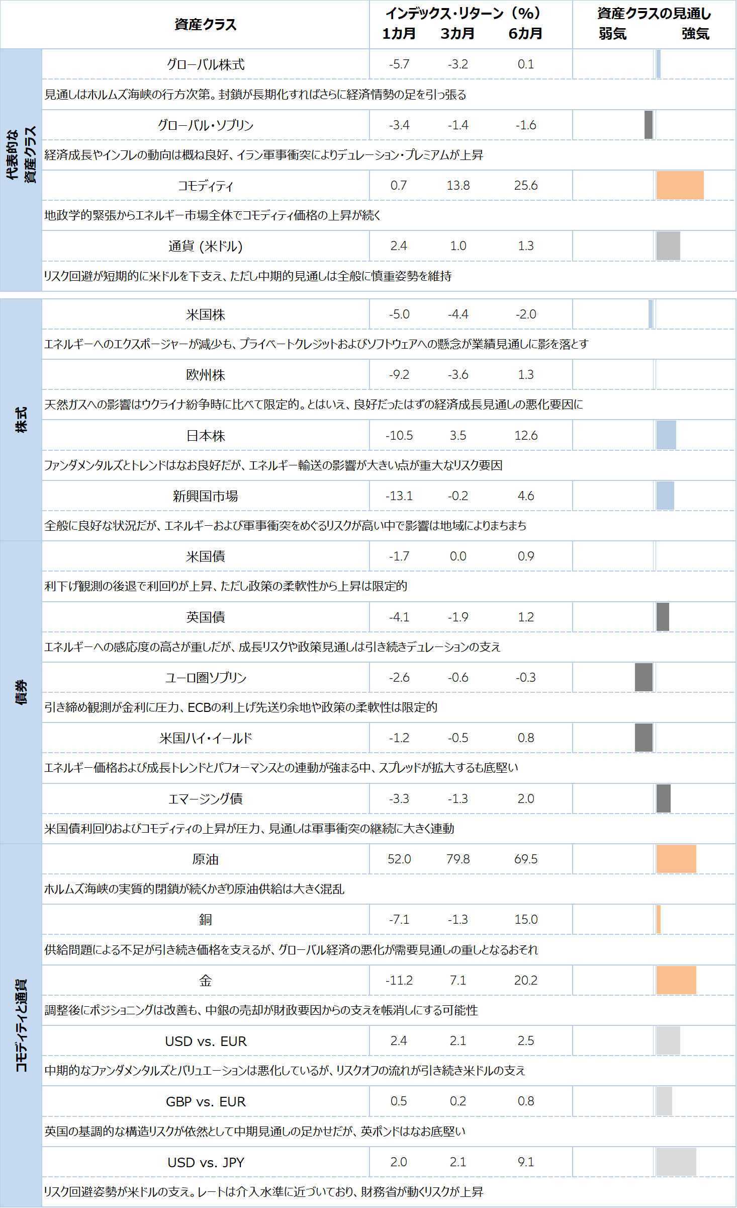 グローバル株式:MSCI World Net Total Return Local Index (USD), グローバル国債:FTSE World Government Bond Index - Developed Markets in USD terms (USD), コモディティ:Bloomberg ex-Agriculture & Livestock Capped 6 Month Forward Index (USD), 為替(米ドル):Bloomberg Dollar Spot, 米国株式:S&P 500 Net Total Return Index, ユーロ圏株式:EURO STOXX 50 Net Return Index (EUR), 日本株式:TOPIX Net Total Return Index (JPY), 新興国株式:MSCI Emerging Net Total Return USD Index (USD), 米国国債:Bloomberg US Govt Total Return Value Unhedged USD Index (USD), 英国債:J.P. Morgan GBI UK Unhedged LOC Index (GBP), ユーロ圏国債:J.P. Morgan EMU Investment Grade - Unhedged EURO Index (EUR), 米国ハイ・イールド債:Bloomberg US Corporate High Yield Total Return Index (USD), 新興国債券:J.P. Morgan EMBI Global Diversified Composite Index (USD), 原油:Bloomberg WTI Crude Oil Subindex Total Return (USD), 銅:Bloomberg Copper Subindex Total Return (USD), 金:Bloomberg Gold Subindex Total Return (USD), 米ドル(USD)と英ポンド(GBP)は、それぞれの通貨対ユーロ(EUR)、米ドル対日本円(JPY)で表示されています。