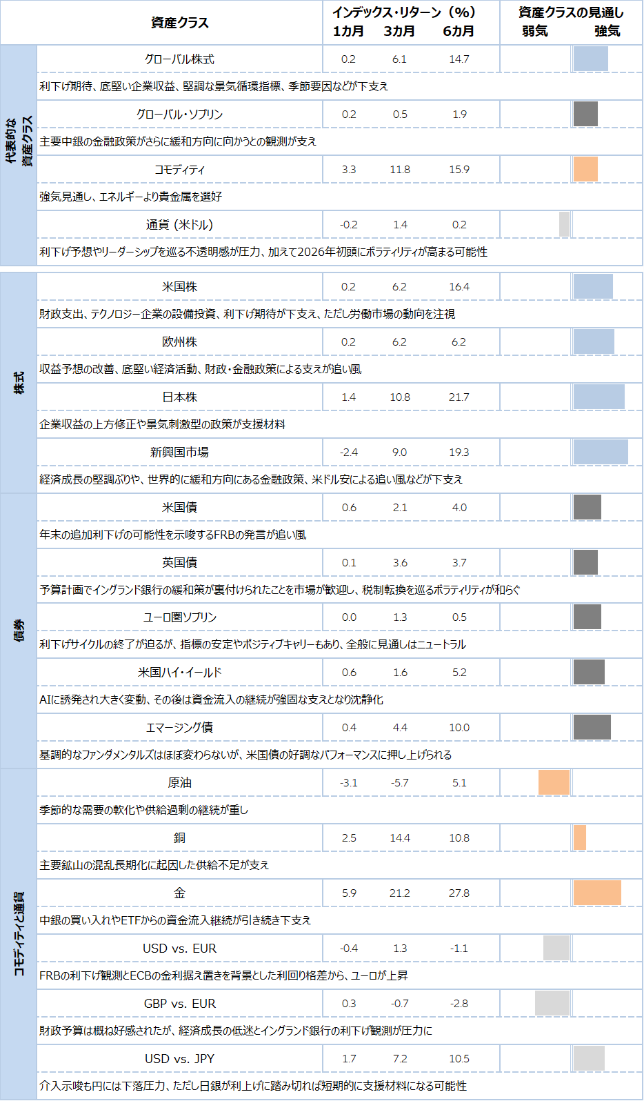 グローバル株式:MSCI World Net Total Return Local Index (USD), グローバル国債:FTSE World Government Bond Index - Developed Markets in USD terms (USD), コモディティ:Bloomberg ex-Agriculture & Livestock Capped 6 Month Forward Index (USD), 為替(米ドル):Bloomberg Dollar Spot, 米国株式:S&P 500 Net Total Return Index, ユーロ圏株式:EURO STOXX 50 Net Return Index (EUR), 日本株式:TOPIX Net Total Return Index (JPY), 新興国株式:MSCI Emerging Net Total Return USD Index (USD), 米国国債:Bloomberg US Govt Total Return Value Unhedged USD Index (USD), 英国債:J.P. Morgan GBI UK Unhedged LOC Index (GBP), ユーロ圏国債:J.P. Morgan EMU Investment Grade - Unhedged EURO Index (EUR), 米国ハイ・イールド債:Bloomberg US Corporate High Yield Total Return Index (USD), 新興国債券:J.P. Morgan EMBI Global Diversified Composite Index (USD), 原油:Bloomberg WTI Crude Oil Subindex Total Return (USD), 銅:Bloomberg Copper Subindex Total Return (USD), 金:Bloomberg Gold Subindex Total Return (USD), 米ドル(USD)と英ポンド(GBP)は、それぞれの通貨対ユーロ(EUR)、米ドル対日本円(JPY)で表示されています。