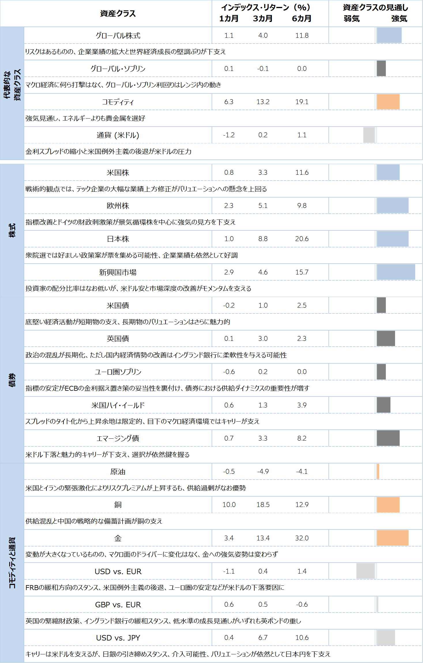 グローバル株式:MSCI World Net Total Return Local Index (USD), グローバル国債:FTSE World Government Bond Index - Developed Markets in USD terms (USD), コモディティ:Bloomberg ex-Agriculture & Livestock Capped 6 Month Forward Index (USD), 為替(米ドル):Bloomberg Dollar Spot, 米国株式:S&P 500 Net Total Return Index, ユーロ圏株式:EURO STOXX 50 Net Return Index (EUR), 日本株式:TOPIX Net Total Return Index (JPY), 新興国株式:MSCI Emerging Net Total Return USD Index (USD), 米国国債:Bloomberg US Govt Total Return Value Unhedged USD Index (USD), 英国債:J.P. Morgan GBI UK Unhedged LOC Index (GBP), ユーロ圏国債:J.P. Morgan EMU Investment Grade - Unhedged EURO Index (EUR), 米国ハイ・イールド債:Bloomberg US Corporate High Yield Total Return Index (USD), 新興国債券:J.P. Morgan EMBI Global Diversified Composite Index (USD), 原油:Bloomberg WTI Crude Oil Subindex Total Return (USD), 銅:Bloomberg Copper Subindex Total Return (USD), 金:Bloomberg Gold Subindex Total Return (USD), 米ドル(USD)と英ポンド(GBP)は、それぞれの通貨対ユーロ(EUR)、米ドル対日本円(JPY)で表示されています。