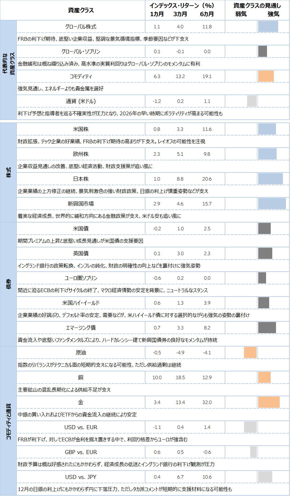 弊社は、FRBの利下げ観測や底堅い企業収益、良好な景気循環指標が2026年年頭も引き続き市場を下支えするとみて、グローバル株式への強気姿勢を強めています。米国、ユーロ圏、新興国市場の株式へのエクスポージャーを増やしており、なかでも新興国株は、堅調な経済成長や米ドル安による政策への追い風を踏まえ、最も強気にみています。また、業績の上方修正の継続や景気刺激型の政策が支えとなる日本株は依然、大きくオーバーウェイトしています。金利では、全般に質の高いデュレーションを強気にみている点に変わりはありませんが、英国債への見解を引き上げたほか、ユーロ圏ソブリン債に対して慎重姿勢を強めました。これは、欧州中央銀行(ECB)による利下げサイクル終了が迫っていることや、バリュエーションの魅力が低下していることを踏まえたものです。クレジットでは、好調な企業業績、デフォルト率の安定、堅調な需要に下支えされる米ハイイールド債への選好姿勢を若干強めました。為替では、米ドルに一段と消極的な姿勢をとっています。コモディティについては、供給制約が続く銅を中心にエクスポージャーを増大させたほか、中銀からの需要が継続しETFによる安定的支えのある金を引き続き最も強気にみています。