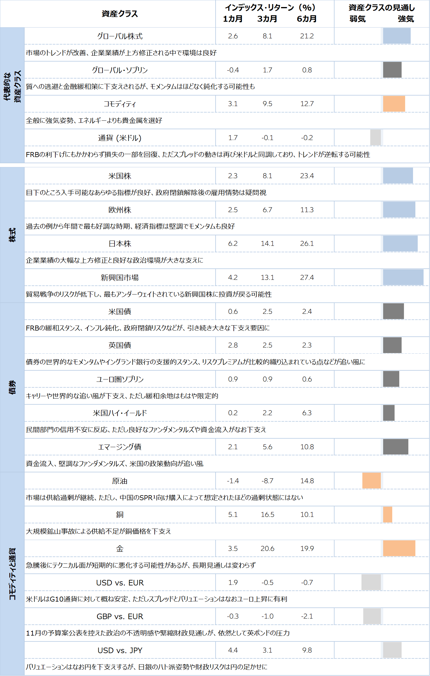 グローバル株式:MSCI World Net Total Return Local Index (USD), グローバル国債:FTSE World Government Bond Index - Developed Markets in USD terms (USD), コモディティ:Bloomberg ex-Agriculture & Livestock Capped 6 Month Forward Index (USD), 為替(米ドル):Bloomberg Dollar Spot, 米国株式:S&P 500 Net Total Return Index, ユーロ圏株式:EURO STOXX 50 Net Return Index (EUR), 日本株式:TOPIX Net Total Return Index (JPY), 新興国株式:MSCI Emerging Net Total Return USD Index (USD), 米国国債:Bloomberg US Govt Total Return Value Unhedged USD Index (USD), 英国債:J.P. Morgan GBI UK Unhedged LOC Index (GBP), ユーロ圏国債:J.P. Morgan EMU Investment Grade - Unhedged EURO Index (EUR), 米国ハイ・イールド債:Bloomberg US Corporate High Yield Total Return Index (USD), 新興国債券:J.P. Morgan EMBI Global Diversified Composite Index (USD), 原油:Bloomberg WTI Crude Oil Subindex Total Return (USD), 銅:Bloomberg Copper Subindex Total Return (USD), 金:Bloomberg Gold Subindex Total Return (USD), 米ドル(USD)と英ポンド(GBP)は、それぞれの通貨対ユーロ(EUR)、米ドル対日本円(JPY)で表示されています。