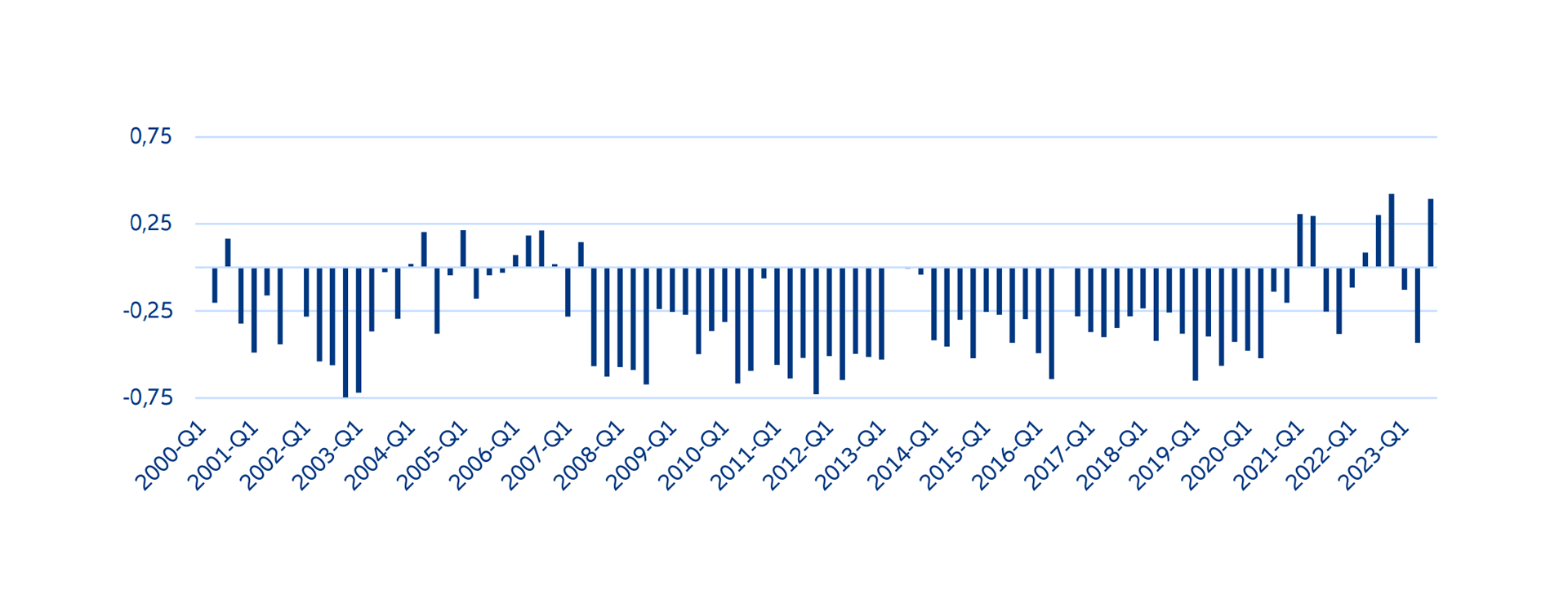 2023年には株式と債券の間に負の相関が再出現しましたが、マルチアセット投資家がこれを歓迎したのも当然といえます。ところが、第3四半期は再び正の相関が特徴的になりました。同時に、第3四半期始めの市場ボラティリティの低さや金融商品のコストの低さを考えると、オプション戦略によって下方リスクを防御できる可能性には非常に訴求力がありました。この先、マルチアセット投資家に一層大きな「うまい話」をもたらしてくれるのがマルチアセットポートフォリオの分散投資のメリットなのか、あるいはビルトインされたリスクマネジメントなのか、という点については、今後を待たなくてはなりません。