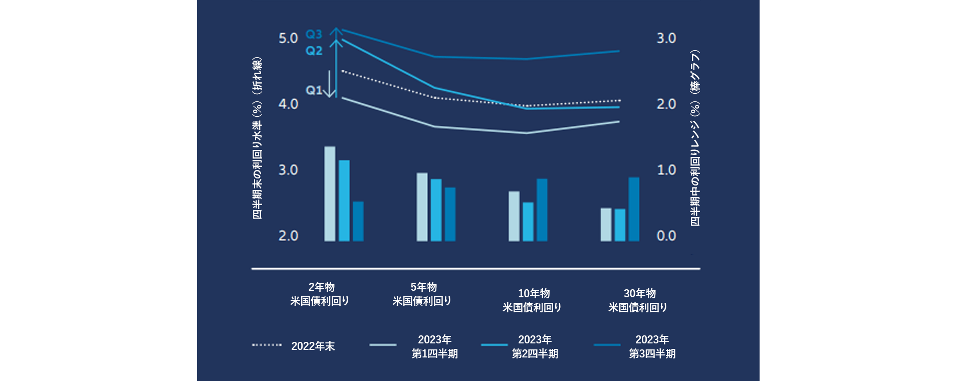 米国債のイールドカーブは、2023年に入ってから大きく変化しています。第1四半期に低下した利回りは一転、第2四半期と第3四半期にわたって上昇し、イールドカーブ全般で第1四半期から100 bp上昇しました。これは、長期にわたり金利を高めに据え置くという米連邦準備制度理事会(FRB)のメッセージに市場がようやく反応したためです。