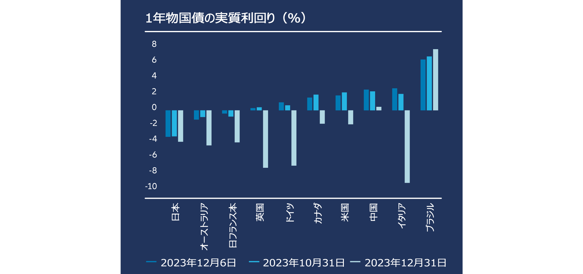 出所:ブルームバーグ、アリアンツGI、2023年11月30日現在のデータ。実質利回りは、現地通貨建て1年物国債の月末利回りを、入手可能な(公式の)月次ヘッドライン消費者物価上昇率(前年比、季節調整前)で調整して算出。過去のパフォーマンス、または予想や予測は、将来のパフォーマンスを示すものではありません。