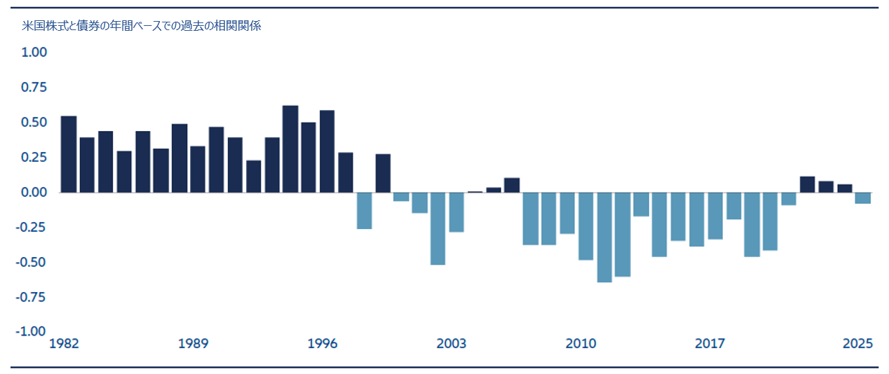 これまで、ポートフォリオに国債と株式を組み合わせることで、リスク調整後のリターンを高めることができるとされてきました。過去数十年にわたり、債券と株式は逆の動きをする傾向があり、一方が好調なときはもう一方が不調になることで、ポートフォリオ全体のバランスが保たれてきました。しかし、2022年以降、両者が同じ方向に動く兆候が増えており(図表1参照)、両資産を保有することによる分散効果が薄れる可能性があります。また、現在の市場環境は「安全資産」に対する従来の考え方にも疑問を投げかけています。2025年には米ドルが軟調に推移しており、米国債の先行きも不透明感が増しています。