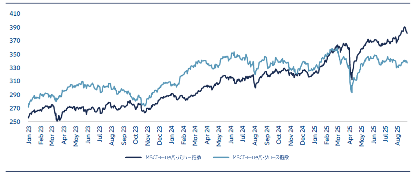 最近では、欧州株式市場でグロース株の弱さが目立ち、バリュー株への関心が高まっています(図表2参照)。一方、米国では過去10年にわたりグロース株がバリュー株を大きく上回るパフォーマンスを示してきました。しかし、金融・財政政策の変化や欧州でのリスク選好の回復により、欧州のグロース株にも再び注目が集まる可能性があります。当社の戦略は、地域・スタイル・セクターごとに柔軟に対応できる設計となっています。