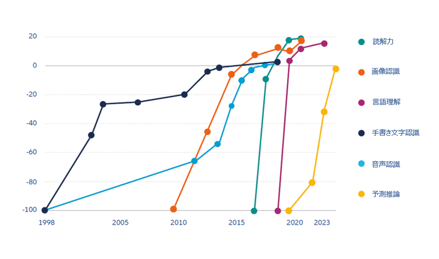 第二に、AIの性能面での飛躍的な進捗です。近年、複数の分野で人間の能力を上回る水準に到達したほか、予測推論における進化も続いており、その進展は漸進的なものではなく、技術革新のスピードを大きく押し上げる加速局面にあります。