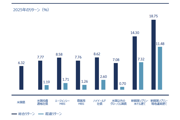 関税をめぐる不透明感、地政学リスク、断続的なボラティリティといった環境下でも、市場は底堅さを維持し、強固なテクニカル要因と安定したファンダメンタルズにより、スプレッドは圧縮した状態が続きました。相対的なバリュエーションに魅力は乏しかったものの、総利回りの高さが引き続きリターンを牽引し、投資適格社債市場における「収益(インカム)」の重要性を改めて示す結果となりました。