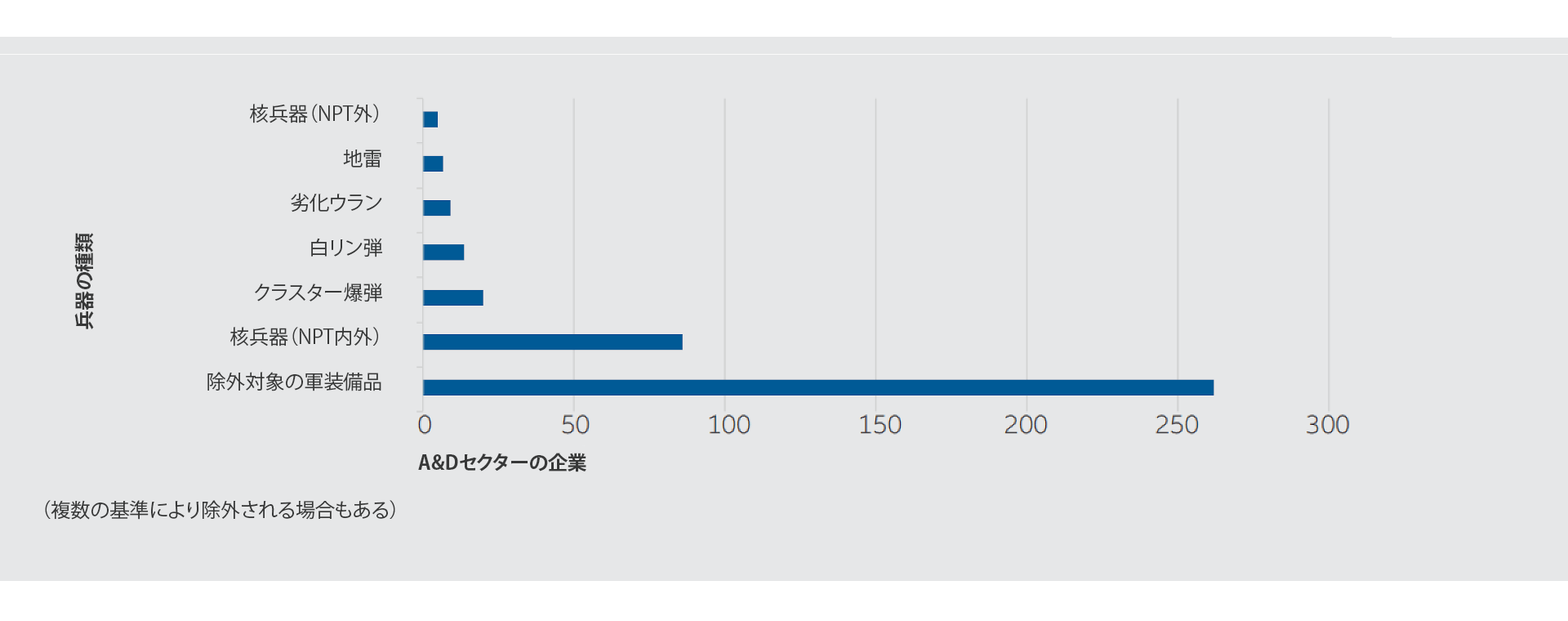 一般に倫理的懸念を引き起こす兵器の開発に関わる上場企業の分析から、このような開発活動は、弊社が定める10%の収益閾値を超えることが判明しています。