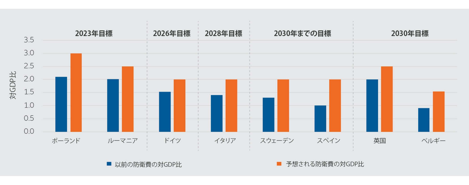 防衛予算の使途も変化しています。例えば、ウクライナ危機が起こるまでは、英国は防衛人員に割いていた防衛費を削ってサイバーセキュリティと航空宇宙に重点的に予算を投じる方針でした。ウクライナ紛争が起こった後、ドイツは軍の最新化に1,000億ユーロを投じることを公約しました。