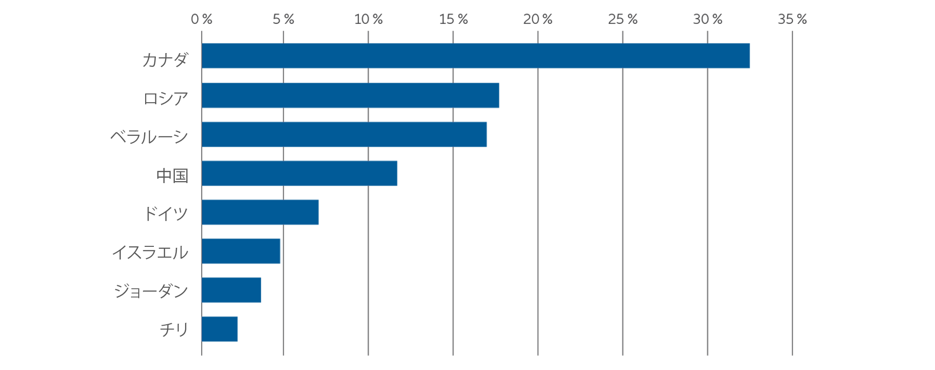 カリの商業生産は、数百万年前に水分が蒸発して形成された鉱床で行われます。こうした蒸発岩は通常、地中の奥深くに存在しているため、鉱石を地表に運んで精錬する伝統的な地下採鉱で採取されます。代替的な生産法として、地下鉱床に水を注入し、鉱床を溶解して地表に汲み上げ、乾燥させて水分を蒸発させる溶解採鉱法などがありますが、従来の採鉱法よりも多くのエネルギーと水を消費します2。世界のカリ生産は現在、カナダに集中―2020年の産出量は世界全体のおよそ3分の1―しており、ロシア、ベラルーシ、中国も主要産出国です。