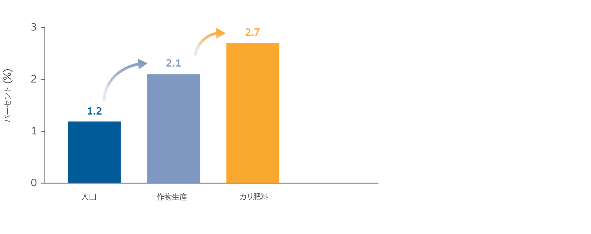 世界人口の成長とそれに伴う食料需要に加え、開発途上国における都市化による耕作可能地の減少を考えると、カリに対する需要は当面の間、大幅な成長が続くと予想されます3。