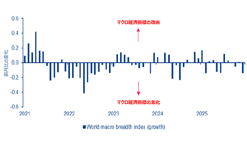 年明けの今、私たちを取り巻く不確実性を考えると、経済がどの程度安定しているかを確認してみる価値があります。2026年初めの世界経済は前年末と変わらぬ様相を呈しており、圧力下にあるものの全体としては安定しています。さまざまなデータから、成長率は今後数四半期で潜在成長率に向けて徐々に収束していくとみられます。国・地域レベルの350以上の指標を集約した弊社独自のマクロ指標も、この見方を裏付けています(「今週のチャート」参照)。とはいえ、経済の勢いには依然としてばらつきがあります。減速のペースは地域によって異なり、見通しは突発的なショックの影響を受けやすい状況が続いているため、方向性が急変する可能性があります。