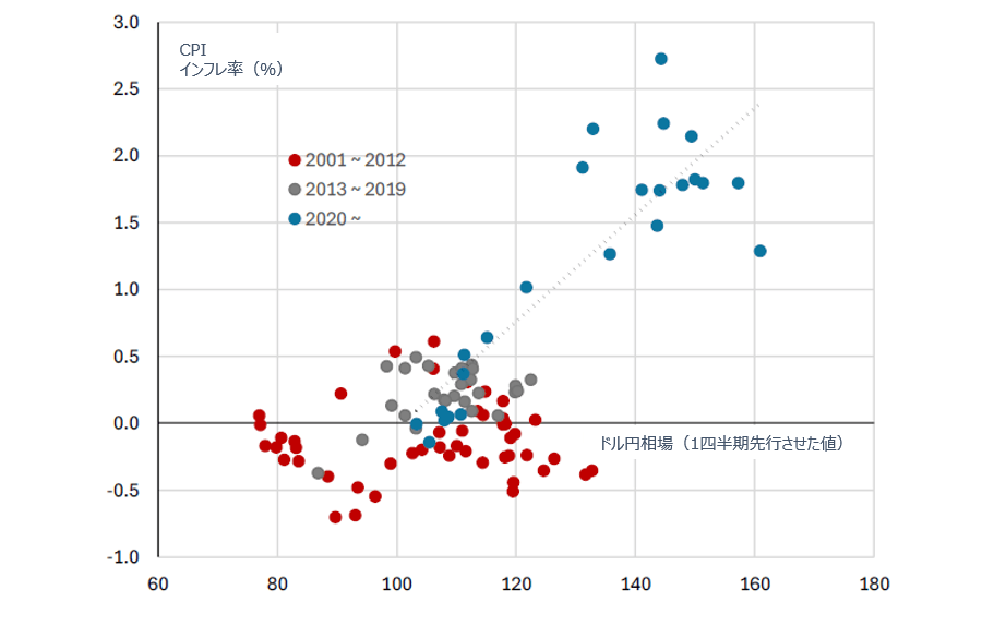 日本の消費者物価指数(CPI、総合)の上昇率は3年以上にわたり、日銀のインフレ目標である2%を上回っており、市場では日銀が「後手に回っている」との見方が強まっています。データを見ると、日本の需給ギャップと基調的インフレ率との相関関係は2020年以降完全に崩れており、インフレが主に需要主導で生じているという見方に疑問を投げかけています。一方で、ドル円相場と基調的インフレ率の相関関係は、コロナ禍の前後を通じて維持されています。このことは、日米金利差の拡大による2022年の急激な円安の方が日本の物価上昇圧力の要因としてより大きいことを示唆しています。