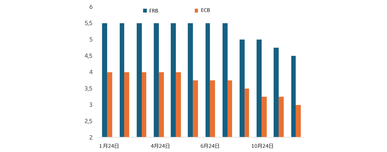 12月の会合前は、ECBは、どの程度抑制的な金融政策をどのぐらいの期間維持するかは、データを指針とすると述べていました。しかし12月に入ってからは、今後発表されるデータが、適切な金融政策決定の検討に影響するだろうと述べるにとどめました。ECBがいまだに現在の状況を抑制的と表現していることを考えると、ECBはインフレ見通しに十分な確信を持っており、当面は追加利下げが基本シナリオになるように見受けられます。その後発表された成長率とインフレに関する材料は、ECBの見方を変えるようなものではないように思われるため、25 bpの利下げが行われる可能性が最も高いと考えます。