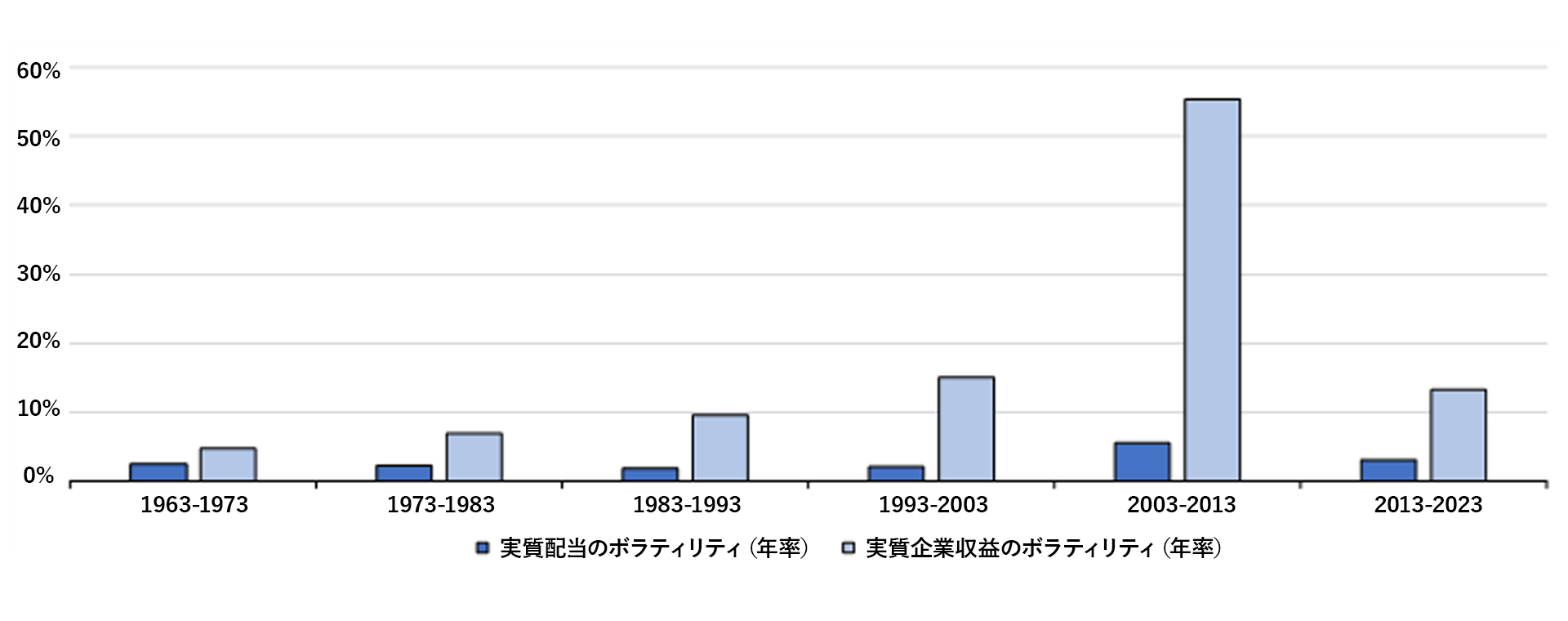 S&P500種構成企業の企業利益と配当のボラティリティ、1962年~2023年12月(年率)