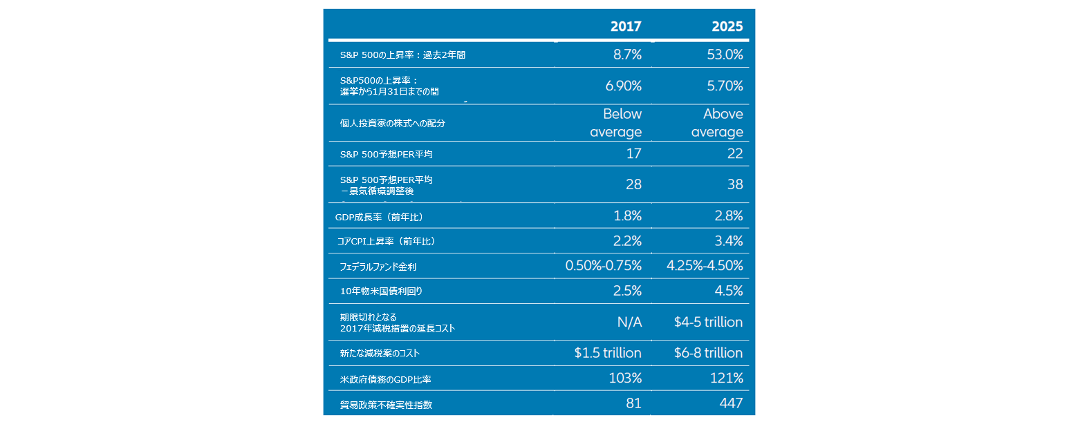 分かっているのは、今日のマクロ環境は、1期目のトランプ政権が引き継いだものとは異なるということです。2017年1月にトランプ氏が大統領に就任したとき、インフレ率はすでに低く、フェデラルファンド金利はゼロ付近にあり、株価は高くなく、それまでの株価の上昇は小幅で、大型の素晴らしい減税が約束されていました。投資家のアニマルスピリットを刺激した、この財政支援の期待は、トランプ大統領が2017年12月22日に1兆5,000億ドルを投じて税制改革に署名したことにより、現実のものとなりました。続いて2018年1月には関税が引き上げられました。最初のターゲットは、洗濯機と太陽光電池でした。
