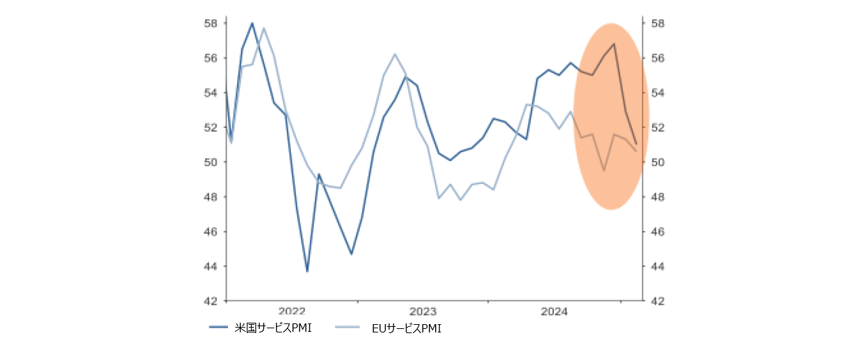 米国の例外主義のピーク? 米国のサービス部門の景況感は最近大幅に低下し、現在はユーロ圏とほぼ同水準