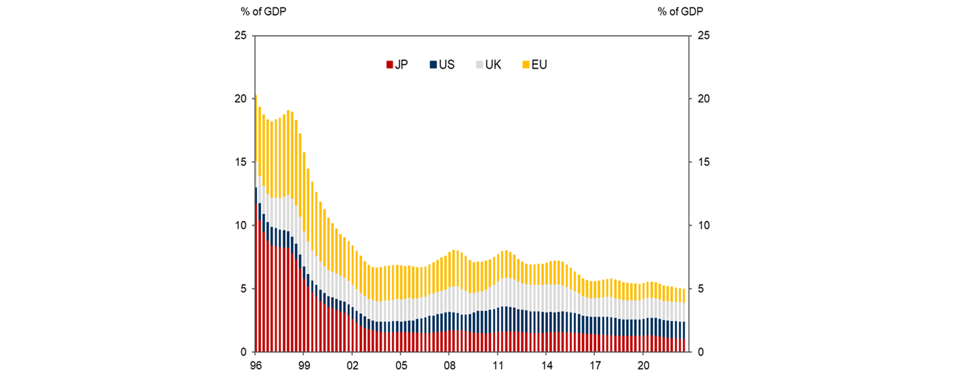貸し手の視点から見ると、EMアジアに対するDM銀行の外貨建て融資の対GDP比は2008年以降、減少しており、安定的に推移しています。弊社の分析によれば、EMアジアにおける米国、EU、英国、日本の銀行からの借り入れは、世界金融危機(GFC)以降着実に減少して、対GDP比およそ5%(中国を除くEMアジアでは10%)まで下がっており、最も高かったアジア通貨危機(AFC)時の20%(中国を除くEMEアジアでは27%)のほぼ3分の1になっています。