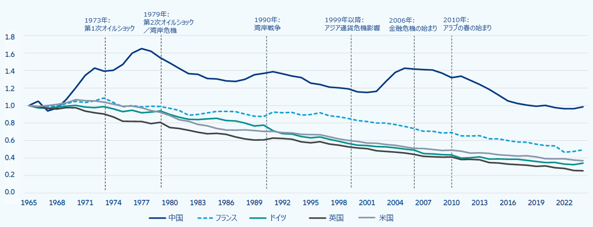 幸いなことに、エネルギー強度は1960年代以降、大幅に低下しています。エネルギー強度とは、国内総生産(GDP)を1単位生み出すために必要とされるエネルギー量を表すものです。今日、米国ではGDPを1単位生み出すために必要とするエネルギーは1960年代の40%にすぎず、ドイツは3分の1以下となっています(「今週のチャート」参照)。言い換えると、ドイツは1965年と比べてエネルギー1単位当たり3倍の生産を実現しています。英国はさらに優れた実績を示しています。