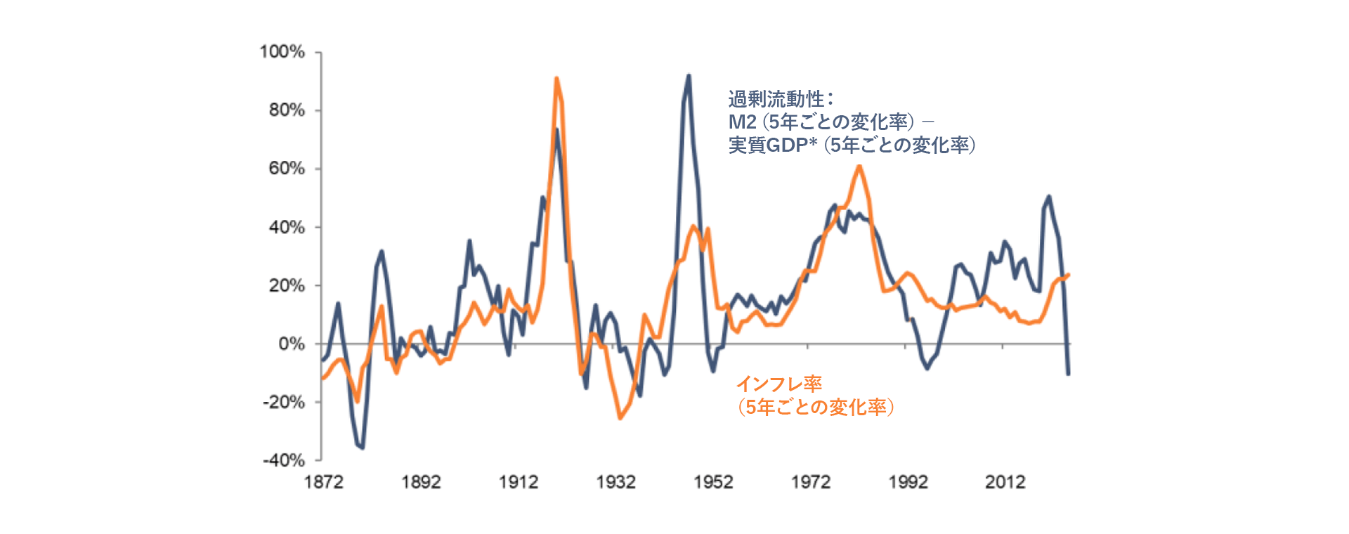 出所: Economics & Strategy Allianz Global Investors, GFD, St. Louis Fed, Refinitiv, annual data, estimates for 2024 and 2025, M2 Monetary Aggregate M2; GDP Gross Domestic Product M2:マネーサプライ GDP:国内総生産