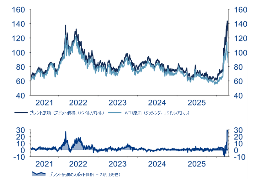 資本市場での綱引き:このように事態が揺れる状態は、今や支配的なパターンになっています。とりわけ株式市場では、イラン戦争とホルムズ海峡危機に新たな展開がある度に、株価の変動に直接反映されています。こうした背景を踏まえると、テクニカルな状況は慎重な様相と言わざるをえず、新たなポジションを取ることに対して誰もが消極的になっています。主要株式市場の相対力指数は中立的な様相を見せています。ここ数週間の変動の中でも主要な抵抗線は持ちこたえており、一部の指数はその水準を上抜ける動きすら見せています。S&P500種株価指数の株価収益率(PER)と、リスク指標であるボラティリティ指数VIXを比較する弊社の「ウェイトレスネス指標」は、若干落ち着きを取り戻しています。すべてが、ホルムズ海峡をめぐる綱引きが決着し、石油が滞りなく供給される方向に進むことを待っているように見受けられます。結果的に、原油価格は引き続き期待と不安の間で揺れており、その動きは、指標としてより重要な先物価格よりも現物市場で目立っています(「今週のチャート」参照)。イラン戦争勃発時と比較すると、ここ数日のブレント原油3カ月先物の相対的な安定は、驚かされるほどです。開戦前に比べればかなり高い水準に達したものの、最近はほとんど上昇していません。世界でもっとも有名な海峡の開放がごく短期間にとどまったにもかかわらずです。
