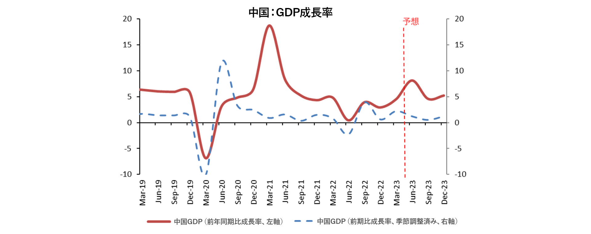 中国の成長回復は、先日公表された2023年第1四半期の国内総生産(GDP)統計が示すように、堅調に進んでいます。ヘッドラインGDPの前年同期比成長率は、前四半期(22年第4四半期)の2.9%から加速して4.5%となり、予想を上回りました。前四半期比ベースのGDPは2.2%増で、これもコンセンサス予想を上回り、前四半期の0.6%増から加速しました。