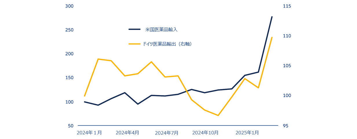 しかし、同じことが今後数カ月の景気の基調についても言えるかどうかは全く不透明です。その理由は、一部の企業が関税を先取りしようと購入を前倒ししたことにあります。「今週のチャート」では、製薬セクターを例にとり、3月に米国の輸入量が急増したことと、おそらくそれと関連してドイツの医薬品生産高が異例の増大を見せたことを示しています。全般的に、対米輸出国の第1四半期の経済活動は、関税が課される前に商品が到着するように行われた発注の恩恵を受けました。こうした前倒しの注文が今後数カ月は新規受注の余地を減少させることは明らかです。つまり、今後数カ月は経済活動が弱まる可能性があります。場合によっては、この影響は大きく、夏まで続くかもしれません。たとえば、米国の2025年3月の医薬品輸入量は前年同月比でほぼ3倍に上りました。