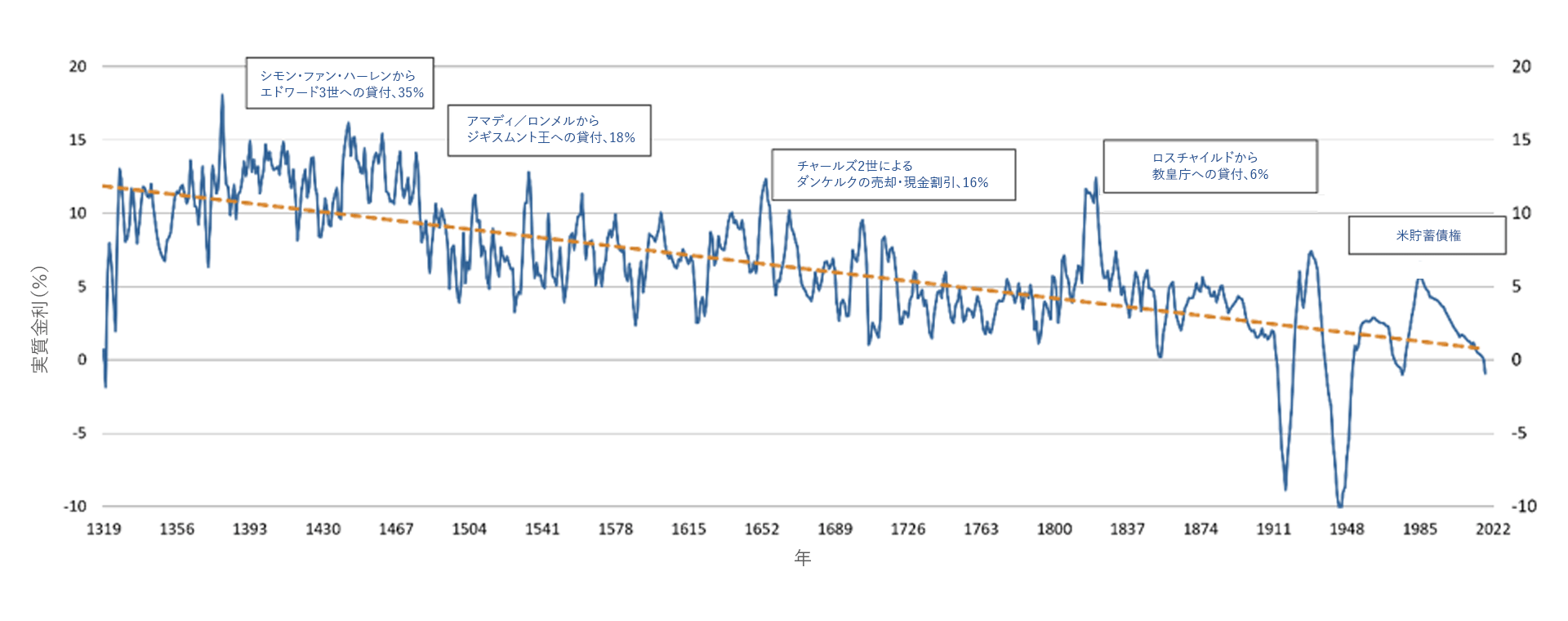 1 出所:Paul Schmelzing - Eight centuries of global real interest rates, R-G, and the ‘suprasecular’ decline, 1311–2018; Refinitiv