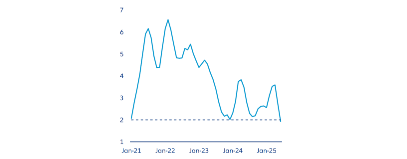 金融市場の急落と急回復に加え、特に注目すべき米国経済のサプライズは、関税引き上げがインフレに即影響を与えるとの予想が実現していないことです。実際、過去3カ月のコアインフレ上昇率(前3カ月比)は、パンデミック後の消費者物価上昇が始まって以来最低水準まで低下しました(「今週のチャート」参照)。