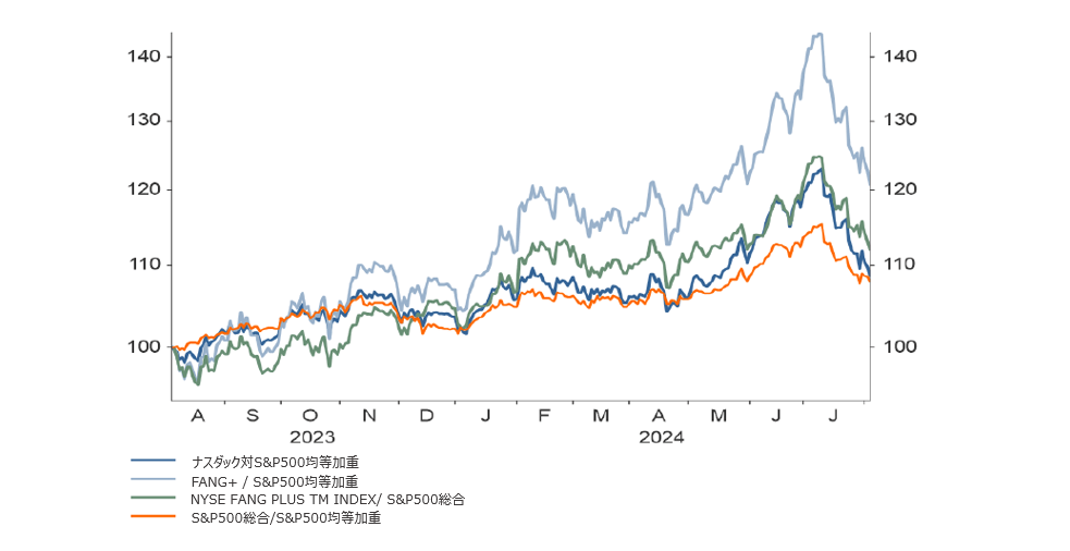 最近の動向が示唆しているのは、現在起こっているのは調整であり、テクニカルな要因もその一端を担っているということです。リスク指標としてのVIX(ボラティリティ指数)に対するS&PのPER(株価収益率)の比率が示すように、ここ数カ月の楽観的な見方は過剰でした。ハイテク銘柄、特に「マグニフィセント・セブン」とその他の銘柄との乖離は、相対的パフォーマンス(「今週のチャート」参照)とバリュエーションの両面で広がりすぎていました。さらに、日本の金融・為替政策の転換により、キャリートレーダーは足元をすくわれました。こうしたことすべてが、北半球が夏休みに入り、取引高が少ない時期に起こりました。月曜日の急落後の反発は、現在の市場の動きを一時的な調整と捉える見方を支持しているように思われますが、安定したトレンドを見出すのは時期尚早です。