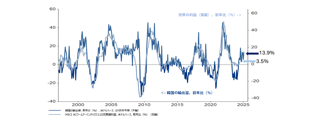 米国と世界の企業利益のさまざまな先行指標に目を向けると、その大半は依然として、今後の堅調な利益成長を示唆しています。こうした指標は、米国企業のCEOのポジティブな景況感(全米産業審議会のCEO信頼感指数)から、韓国のようにグローバル経済にしっかり組み込まれている国における急速な輸出の伸び(「今週のチャート」参照)まで多岐にわたります。米国の銀行が企業向け融資基準を緩和していることも、利益の追い風となる兆候です。