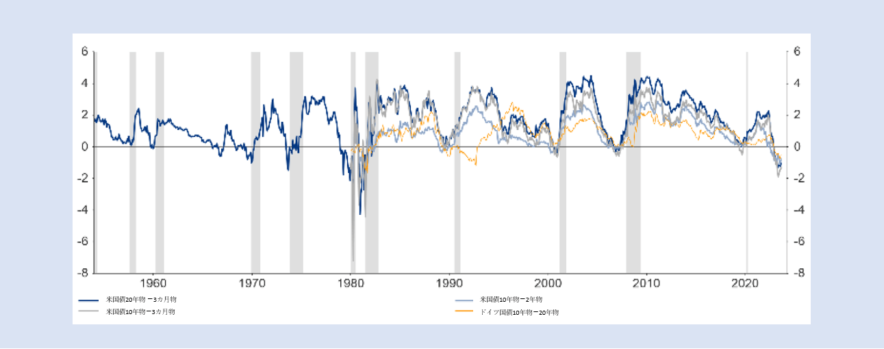 米国債とドイツ国債のイールドカーブ。網掛け部分は、全米経済研究所(NBER)が認定したリセッションを表す。