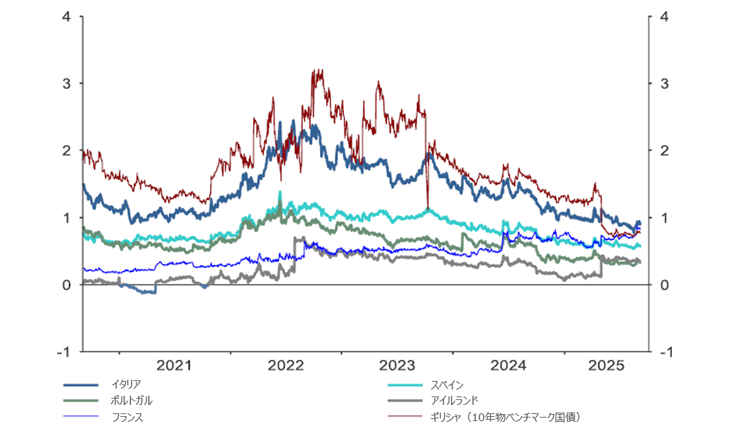 そしてフランスの場合、債務残高対GDP比は115%に上っています。フランス政府が方向転換しなければならないことは明白であるものの、問題はそのために必要な過半数の議席を得ていないことです。またもや不信任投票でフランソワ・バイル首相率いる政権が失脚した今、この国はこれからどこへ向かうのでしょうか。この先荒波が待ち受けていることは確実です。今回の騒動以前から、ドイツ国債に対するフランス国債のスプレッドは拡大しており、いまやギリシャ国債のスプレッドすら上回り、イタリア国債の水準に近付きつつあります(「今週のチャート」参照)。ちなみに米国の政府債務の対GDP比も100%に達し、今後数年でさらに上昇すると予想されています。同時に、主要国債では長期債の利回りが上昇を続けており、30年物英国債はすでに5%の大台を超え、30年物米国債もその水準に迫っています。日本でさえ、利回りが上昇しています。こうした動向はいずれも危険な前兆であり、各国政府を圧迫しています。これは特に、政府債務比率が235%に達する日本に当てはまります。にもかかわらず、石破首相の辞任により、日本の財政政策は拡張的な方向に向かう兆しを見せています。新政権は、インフレ対策を目的とした景気刺激策を導入すると予想されます。物価高対策として与党自民党が提案している現金給付に加え、景気刺激策には、子育て支援の強化など的を絞った財政支出が含まれる見込みです。
