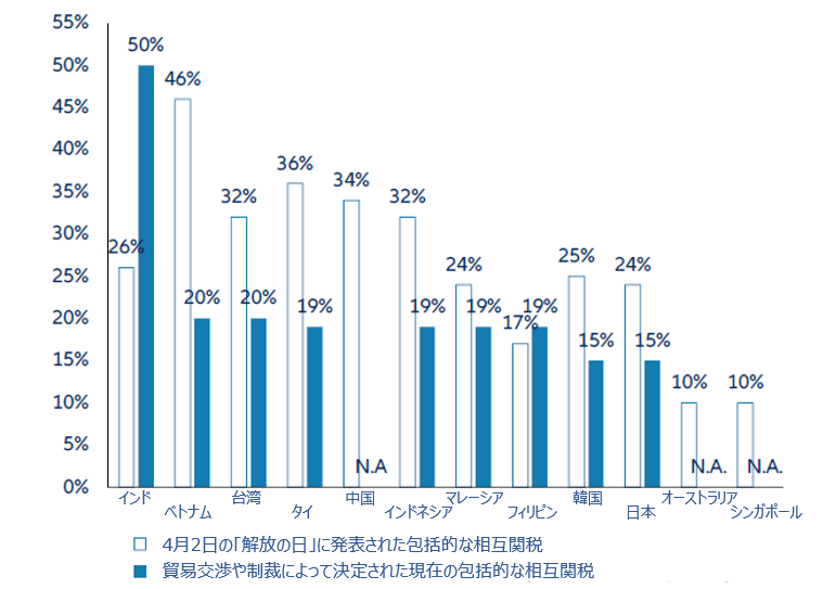 トランプ大統領の貿易戦争をめぐる不確実性の大部分は、貿易協定の締結が進んだことで解消されたものの、ほぼすべてのアジア諸国において、米国の関税率は年初に比べはるかに上昇しました。とはいえ、中国に対する関税率は一時の145%から大幅に引き下げられ、大半のアジア諸国に対する関税率は現在、トランプ大統領が「解放の日」(4月2日)に設定した当初の水準を下回っています。