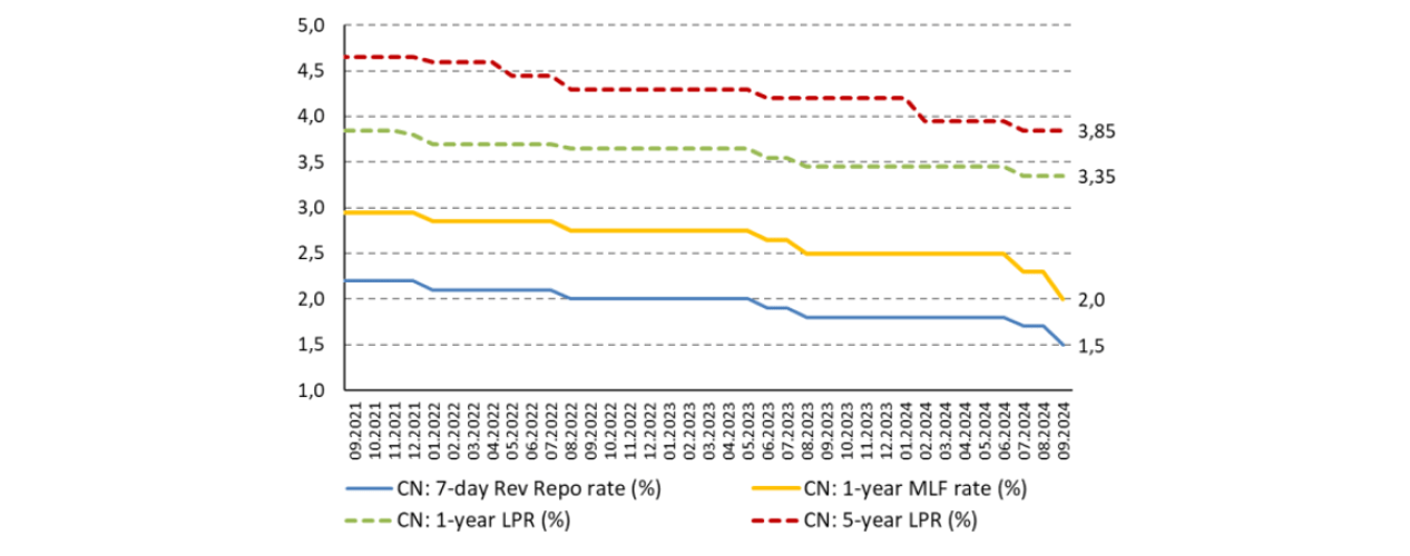 金融政策に関しては、中国人民銀行(中国の中央銀行)の戦略は、金利を引き下げ、中国の家計・企業の貯蓄と投資への配分決定のリバランスによって景気浮揚を図ることだと考えます。その目的は、銀行預金を中国の閉鎖的な資本制度内にある国内のリスク資産市場(株式と不動産)に流入させることにあります。不動産セクター緩和策と株式市場支援策が同時に発表されたのは、そのためでした。中国人民銀行が9月24日に行った政策金利と預金準備率の引き下げは始まりにすぎないと考えられます。米連邦準備制度理事会(FRB)が金融緩和政策を進めていることから、中国でもさらなる金融緩和の動きが続く可能性があります。