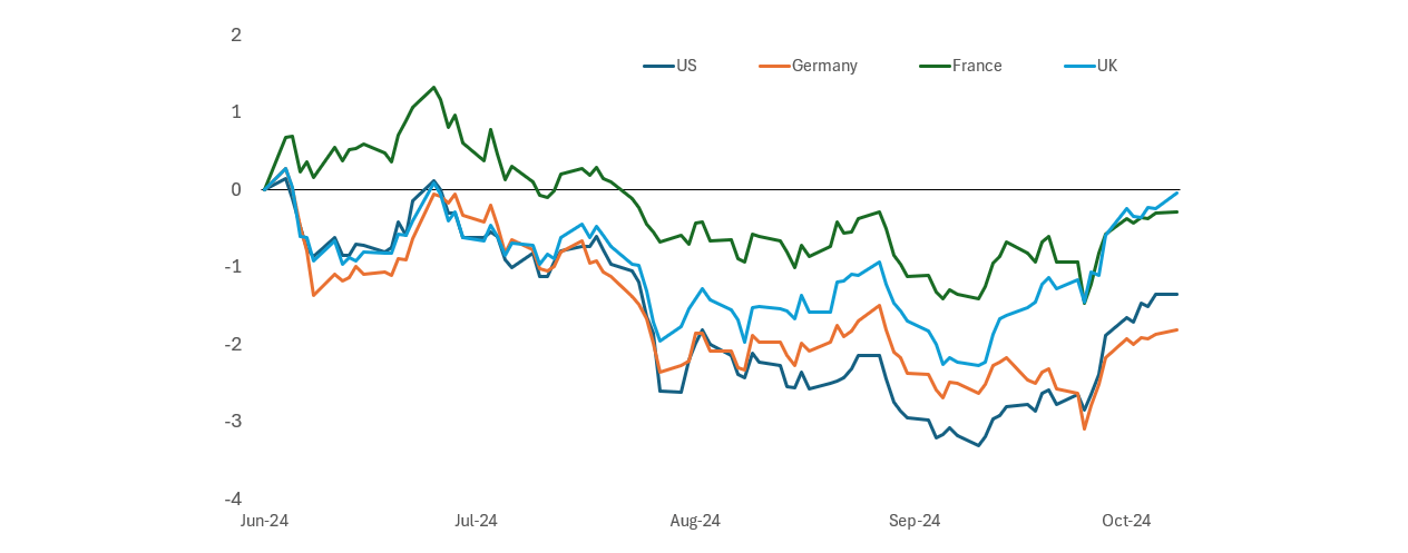 フランスと英国の政治と政策のサイクルが6月以降、期せずして同じようなタイミングで動いており、両国の10年債の利回りは欧州議会選挙後の4カ月間、他国よりも高止まりしています。欧州議会選挙後、ドイツの10年債利回りが35ベーシスポイント(bp)低下したのに対し、フランスの10年債利回りは5 bp低下し、英国の10年債利回りはわずか1 bpの低下にとどまりました。