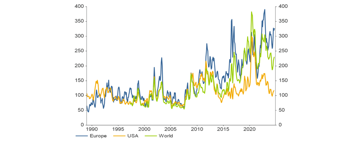 もう一つの顕著な傾向は、世界の一部地域で、経済政策に関する報道から不確実性の高まりがうかがえることです。少なくとも「経済政策不確実性指数」は、そう示唆しています。この指数は、経済や経済政策に関する各国の報道を分析し、高いリスクや不確実性をはらむニュースを集約して指数化したものです。興味深いことに、この指数は、米国については中立的な水準で推移しているものの、世界全体の報道、特に欧州の報道は、経済リスクを際立たせるニュースの割合がかなり多くなっています(「今週のチャート」参照)。欧州の報道では、ドイツの動向が大きな比重を占めています。
