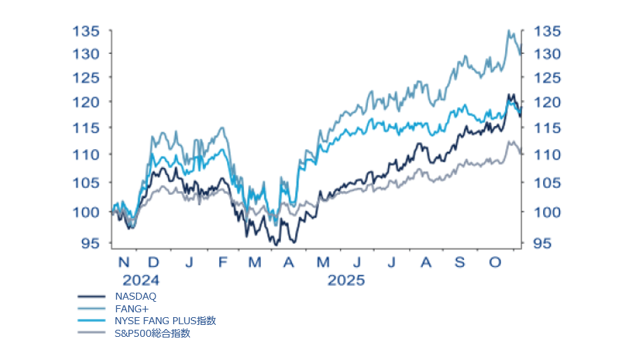 世界的な貿易摩擦の影響は今のところ、当初懸念されていたほど深刻ではありませんが、その影響が顕在化するまでタイムラグがありそうです。最近の人工知能(AI)投資ブームをもってしても、世界経済が依然として脆弱な均衡状態にあることは隠しきれません。テクノロジー主体の生産性向上に期待が高まる一方で、過剰投資サイクルに陥るリスクも増大しています。同時に、大手AI企業がその極めて高いバリュエーションを正当化できるだけの利益成長を遂げているかどうか、疑問視する声が高まっています。米政府閉鎖の解消への期待により株式市場は上昇しましたが、その直前まで、テクノロジーセクターをめぐる懸念がパフォーマンスの重しとなっていました(「今週のチャート」参照)。