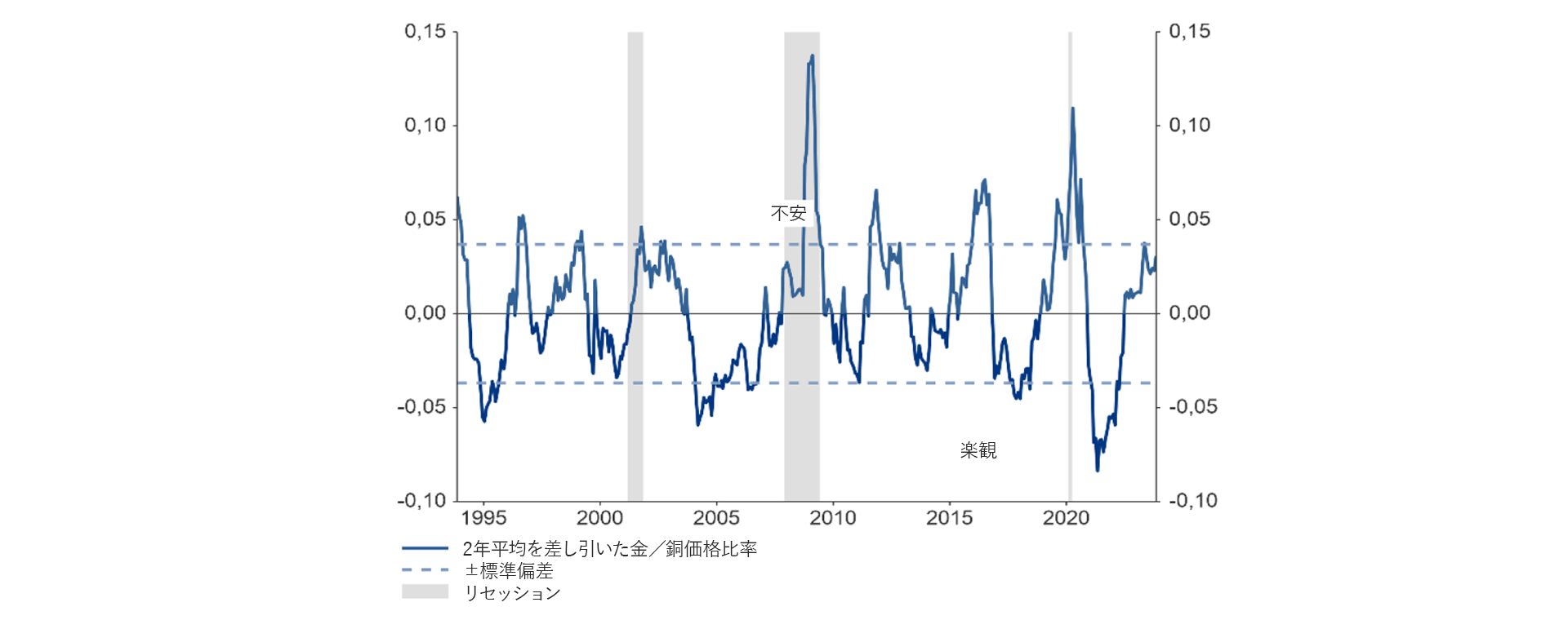 テクニカルな状況は不透明です。主要株式市場の主なベンチマーク指数は、30日移動平均近くにあり、相対力指数はニュートラルな水準にあります。金(警戒感を示す指標となる)と銅(経済成長の先行指標となることが多い)の相対的価格から判断すると、警戒感が広がっています(「今週のチャート」を参照)。