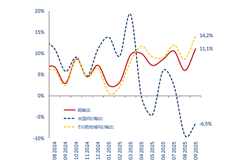 他国と一線を画しているのが中国で、米国と実質的な貿易交渉を行っています。米国がハイテク製品への中国のアクセスをさらに抑制し、海運手数料を課そうとしたのに対し、中国は世界的なレアアース供給における支配的地位を利用して米国の動きを阻止しました。トランプ米大統領が10月下旬に中国のフェンタニル関連関税を10ポイント引き下げる決定を下したことで、米国の対中貿易加重平均関税率は以前の42%から32%に低下したと推定されます。双方はまた、両国間の制裁を1年間停止することで合意し、首脳の相互訪問への道を開きました。これは、両国関係の緊張緩和を示唆しています。