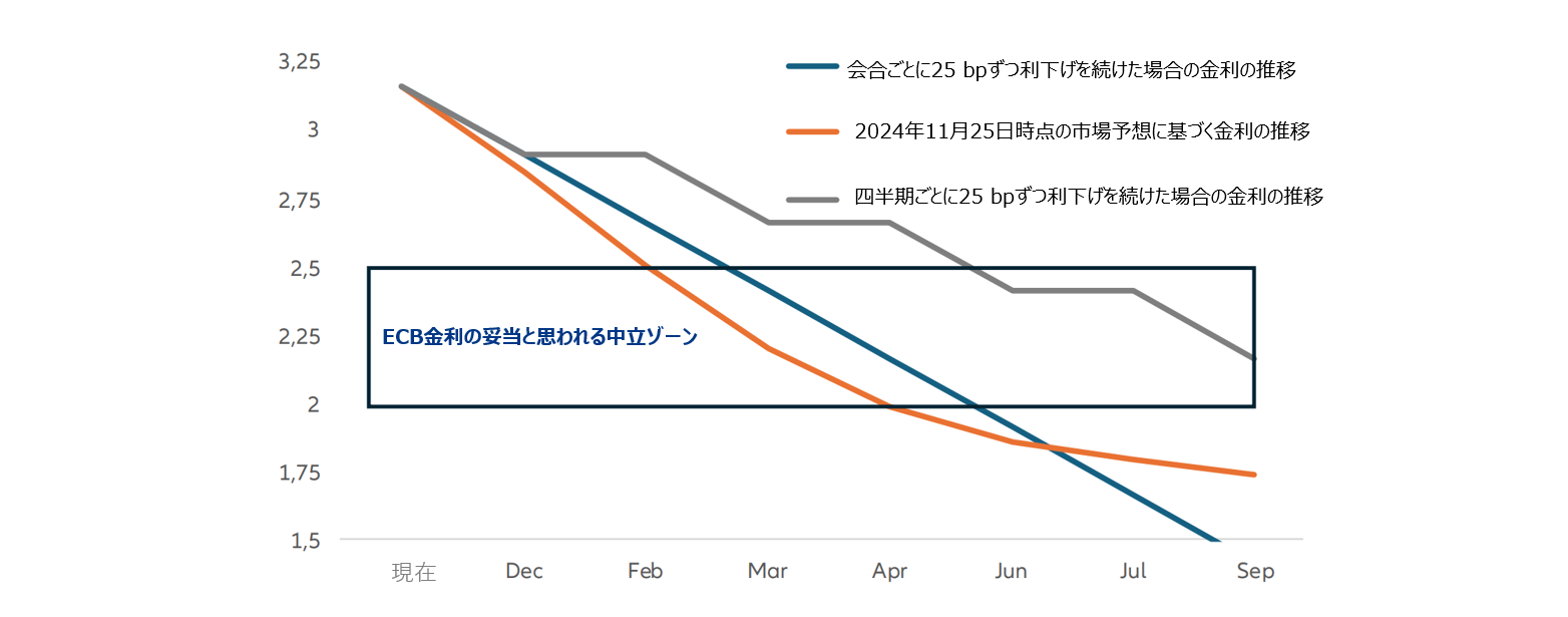 ECBが12月の時点で、これらの戦略のいずれかに事前コミットすることはないと思われます。しかし、利下げのペースを加速させ、場合によっては下げ幅を拡大することの妥当性が次第に強まっていると考えます。投資家は来年の現金保有によるリターン低下の可能性を検討するにあたり、この点を考慮に入れる必要があります。