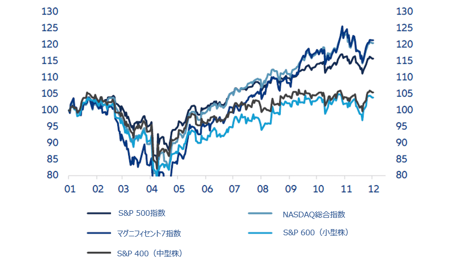 - 市場環境を考慮すると、ポートフォリオの株式配分において欧州株により大きなウェイトを置くのが妥当でしょう。バリュエーションが割安であること、一握りのテクノロジー株への集中リスクが低いこと、そしてインフラと国防能力強化のための政府の投資計画という形での政治的支援を考えると、2026年の欧州は米国より魅力的なリスク・リターン・プロファイルを提供すると思われます。テクノロジー株とAIは米国株式市場の基調を形作っており(「今週のチャート」参照)、一部では非常に野心的なバリュエーション水準で取引されています。少数のAI銘柄への集中度が極めて高いため、調整に対してより脆弱である可能性があります。